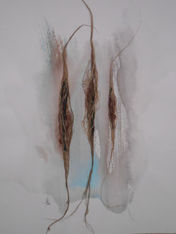 ![]() Ecritures sacréesAcrylique sur toile + fils.Format 30x30 | ![]() Monotype encre sur papier + fil.Format 52x52 |